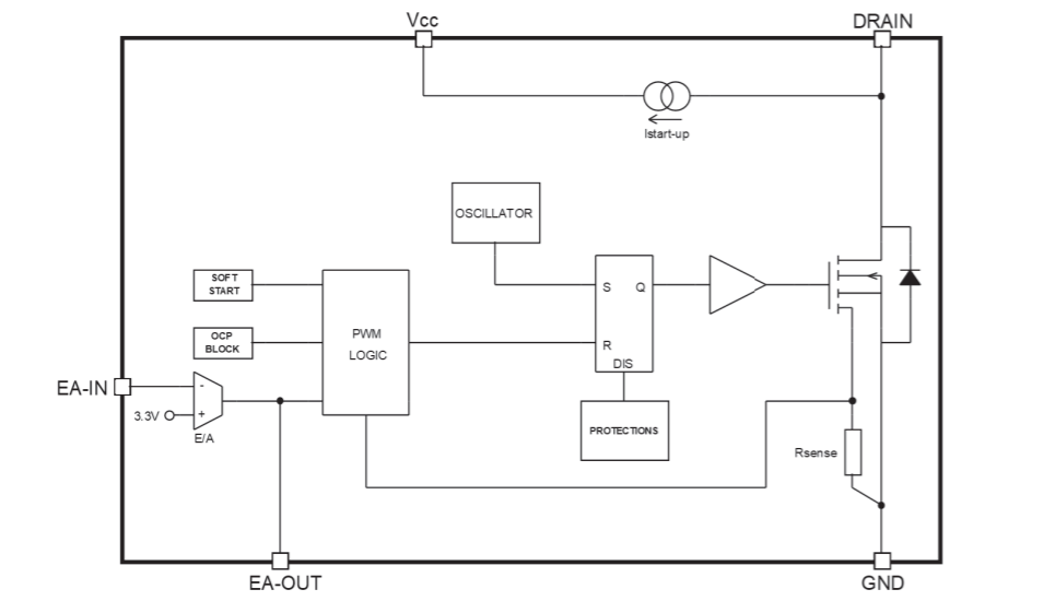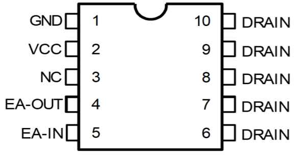 VIPer122系列器件采用10引腳的封裝方式,包括:1個(gè)GND、1個(gè)VCC、1個(gè)NC、1個(gè)EA-OUT、1個(gè)EA-IN和5個(gè)DRAIN。其中,內(nèi)置高壓開關(guān)啟動(dòng)偏置電流來自DRAIN。